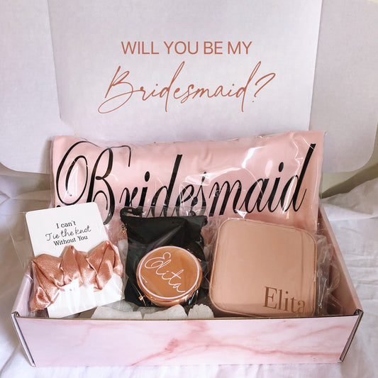 Imagine the joy on your bridesmaid's face when they receive a personalized gift box, filled with engraved champagne flutes, luxury robes, cards and delicate jewellery boxes—perfect for showing your appreciation and creating lasting memories together.