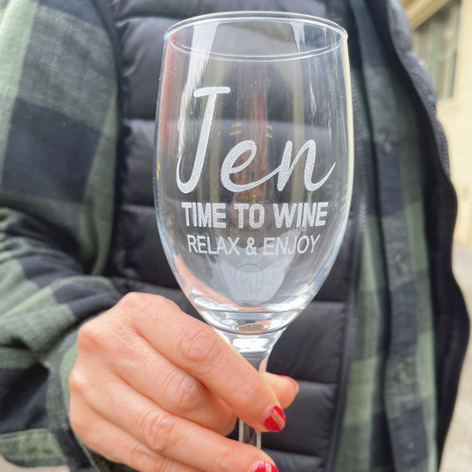 "TIME TO WINE, RELAX & ENJOY" Engraved Wine Glasses